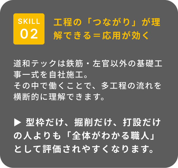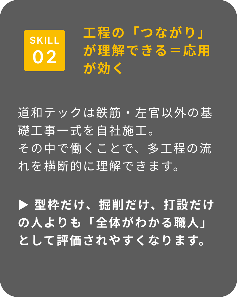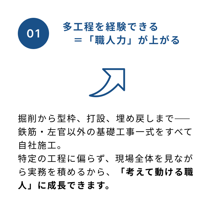 型枠だけ、掘削だけ、という分業型ではないからこそ、職人としての「総合力」が育ちます。