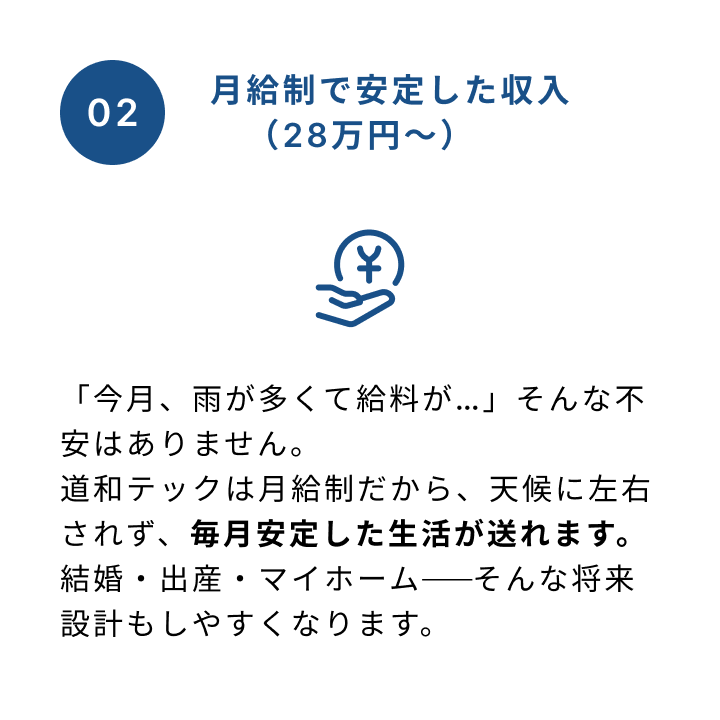 月給制:280,000円~(経験・能力を考慮の上決定)※日給制ではなく、雨天や天候不良でも収入が安定します