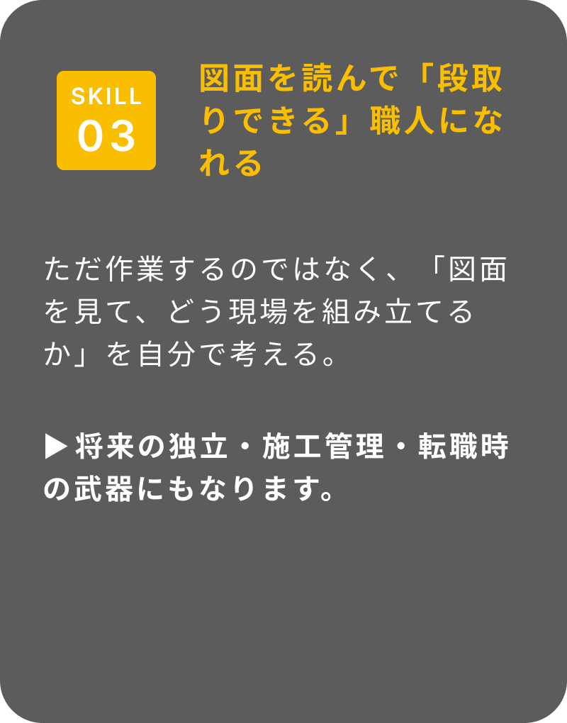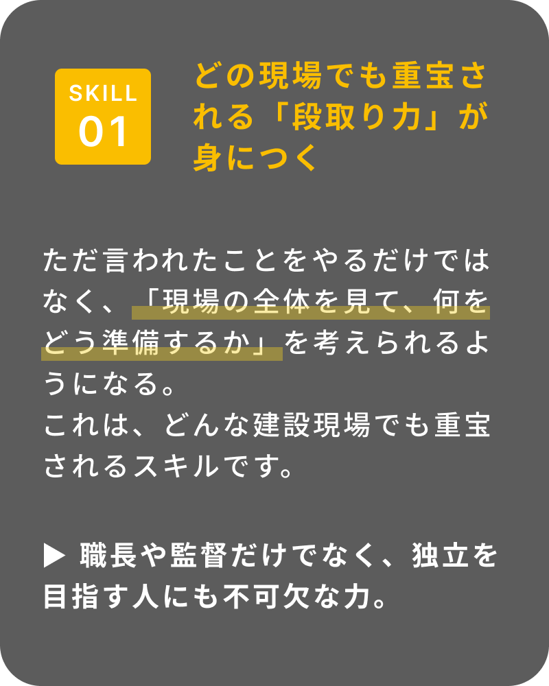 ✔️ 型枠だけじゃなく、現場全体を見て動けるようになりたい