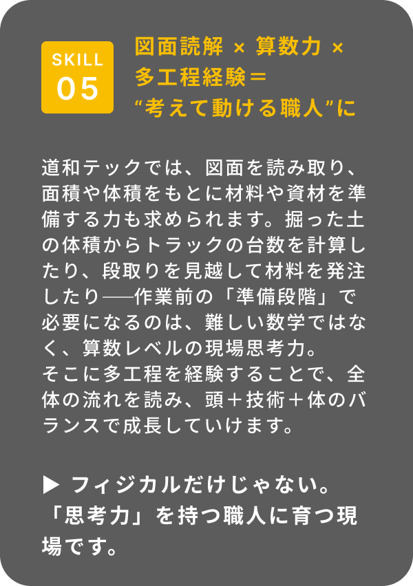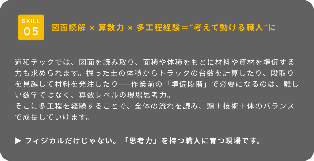 図面を読み、面積を計算し、材料や人の動きを段取りする——例えば、掘削の深さをもとに土の体積を出す、トラックの台数を見積もる。そんな日々の積み重ねが、「ただ動く」から「考えて動ける」職人へとあなたを育ててくれます。