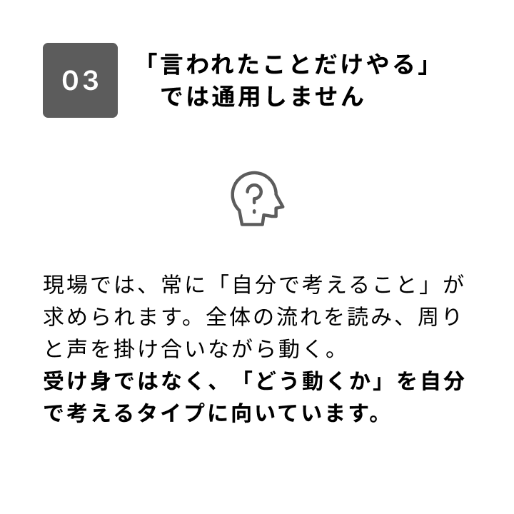 ここで求められるのは「強い人」ではなく、「前向きに向き合える人」。体力や技術は、あとから身につけられます。