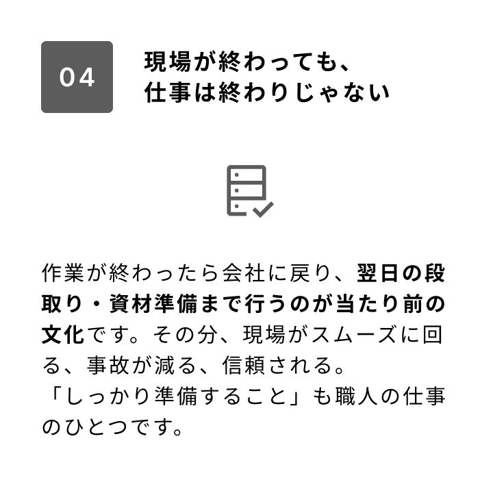 現場で汗をかく職人、その段取りを整える準備担当、安心して働ける仕組みを支える事務スタッフ。どれか一つが欠けても、いい仕事はできません。