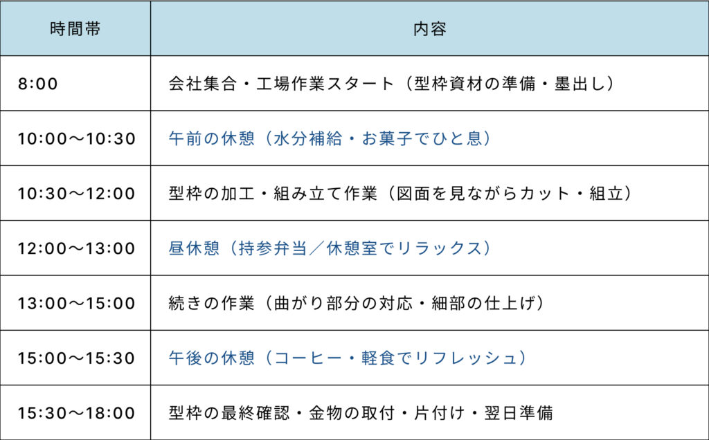パターン2:工場作業の日のスケジュール(型枠づくり中心)