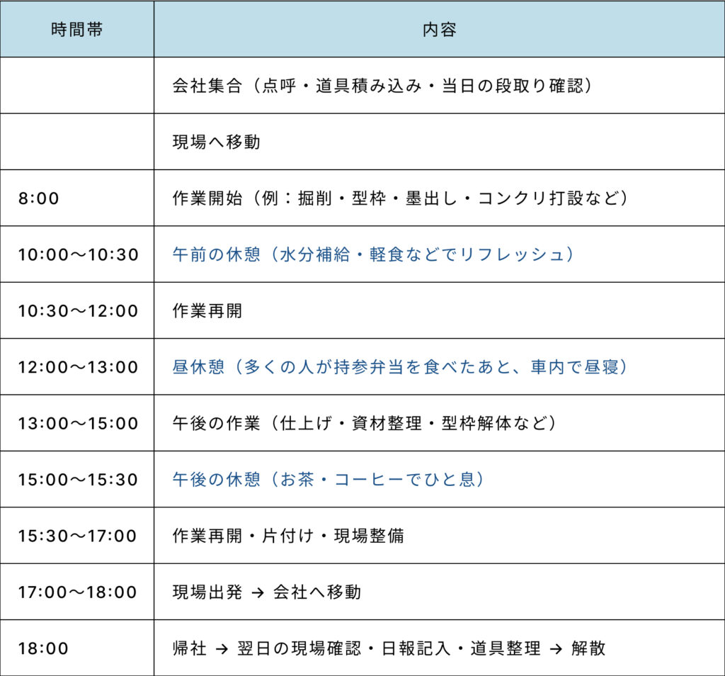会社集合→8:00 現場作業開始〜17:00 作業終了